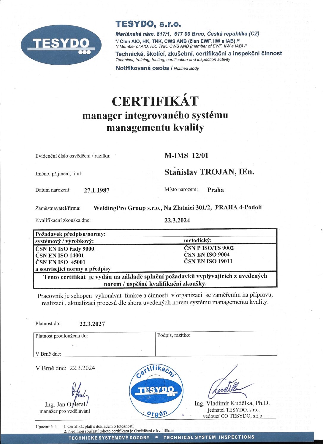 Certtifikát Manažera Kvality ISMK