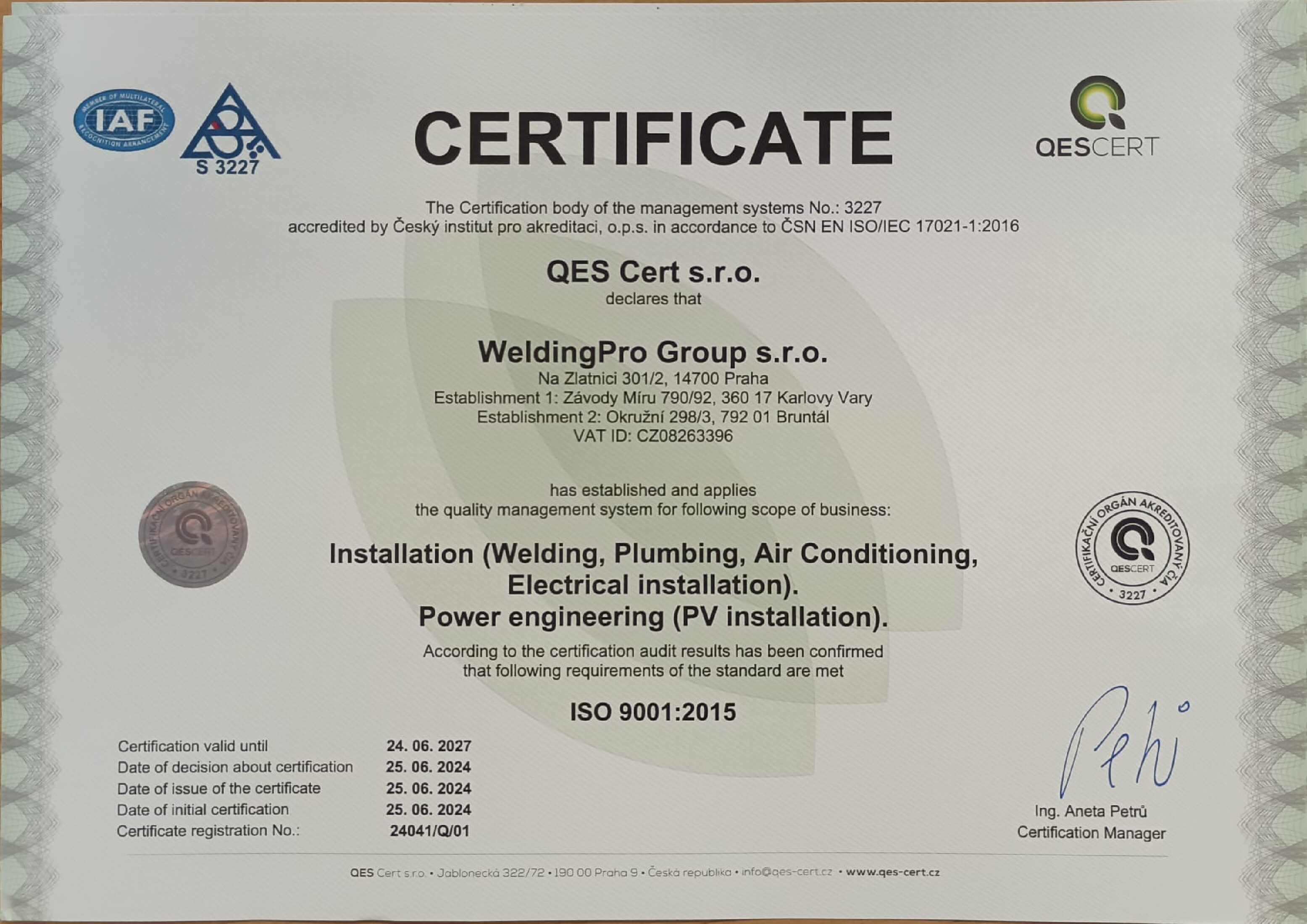 Certifikát způsobilosti výrobce ČSN EN ISO 3834-2