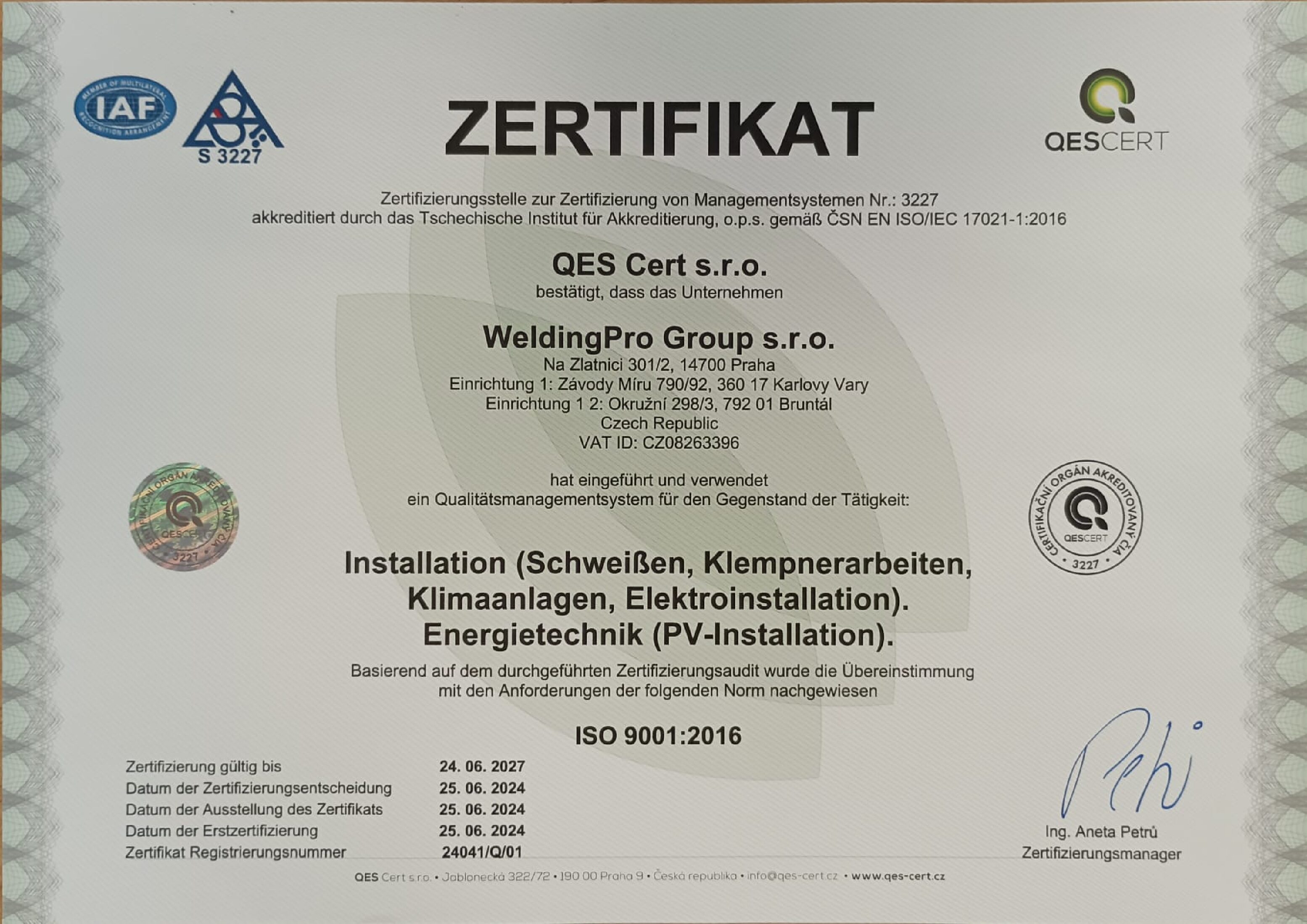 ČSN EN ISO 9001 2016 Certifikát CZ